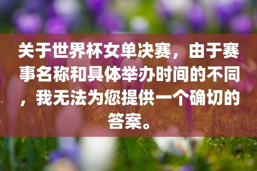 摘要:关于世界杯女单决赛的具体信息,由于赛事名称和举办时间的不确定性,无法提前给出确切答案。需待赛事官方公布详细信息后,才能得知女单决赛的具体安排和进展。