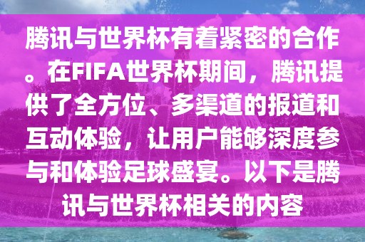 腾讯与世界杯有着紧密的合作。在FIFA世界杯期间,腾讯提供了全方位、多渠道的报道和互动体验,让用户能够深度参与和体验足球盛宴。以下是腾讯与世界杯相关的内容
