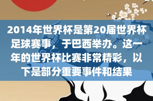 2014年世界杯是第20届世界杯足球赛事,于巴西举办。这一年的世界杯比赛非常精彩,以下是部分重要事件和结果