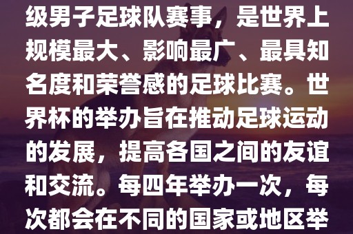 世界杯是由国际足球联合会主办的一项国家级男子足球队赛事,是世界上规模最大、影响最广的足球比赛。旨在推动足球运动的发展,增进各国之间的友谊和交流,每四年举办一次。世界杯历史悠久,自1930年举办以来,已经成功举办了二十几届,对于足球爱好者来说具有极高的荣誉感和知名度。