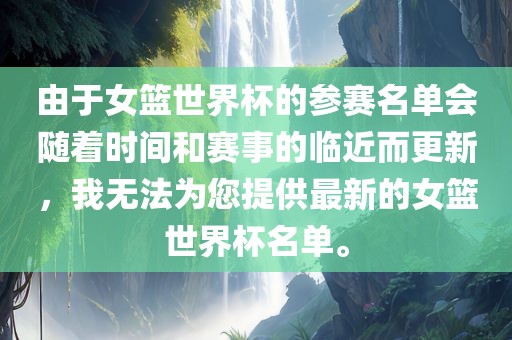 建议您关注相关的体育新闻网站或官方体育网站,以获取最新和准确的女篮世界杯名单,这些网站通常会及时更新并发布有关参赛队伍和球员的最新信息,您也可以关注相关的社交媒体账号,以获取最新的体育资讯和更新。