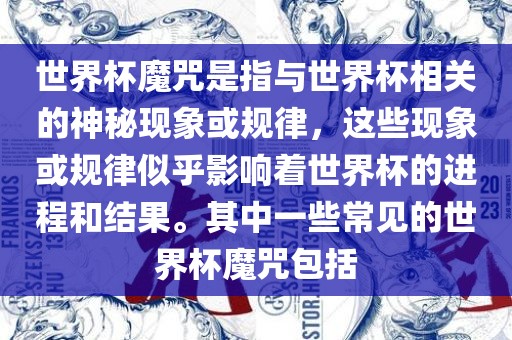 世界杯魔咒是指与世界杯相关的神秘现象或规律,这些现象或规律似乎影响着世界杯的进程和结果。其中一些常见的世界杯魔咒包括