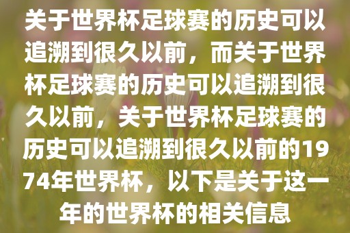 关于世界杯足球赛的历史可以追溯到很久以前,而关于世界杯足球赛的历史可以追溯到很久以前,关于世界杯足球赛的历史可以追溯到很久以前的1974年世界杯,以下是关于这一年的世界杯的相关信息