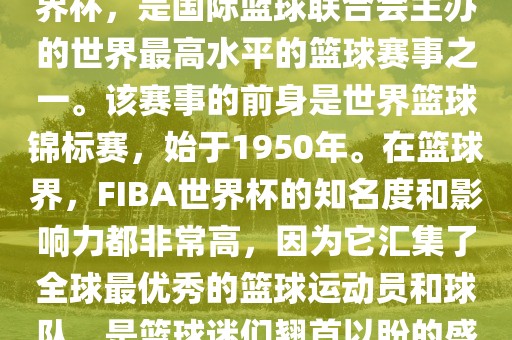 FIBA世界杯,也被称为篮球世界杯,是国际篮球联合会主办的世界最高水平的篮球赛事之一。该赛事的前身是世界篮球锦标赛,始于1950年。在篮球界,FIBA世界杯的知名度和影响力都非常高,因为它汇集了全球最优秀的篮球运动员和球队,是篮球迷们翘首以盼的盛事之一。