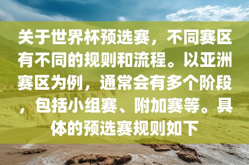关于世界杯预选赛,不同赛区有不同的规则和流程。以亚洲赛区为例,通常会有多个阶段,包括小组赛、附加赛等。具体的预选赛规则如下