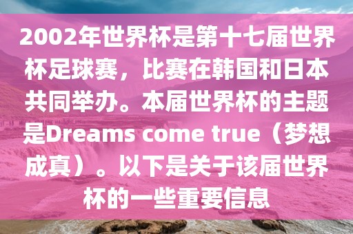 2002年世界杯是第十七届世界杯足球赛,比赛在韩国和日本共同举办。本届世界杯的主题是Dreams come true(梦想成真)。以下是关于该届世界杯的一些重要信息