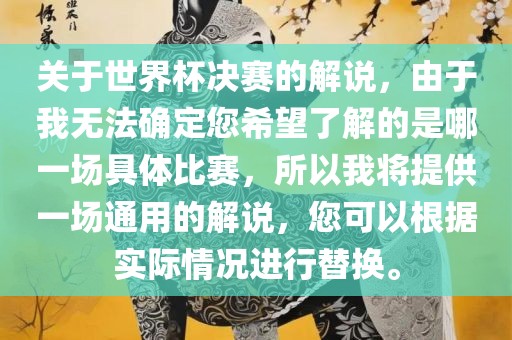 关于世界杯决赛的解说,由于我无法确定您希望了解的是哪一场具体比赛,所以我将提供一场通用的解说,您可以根据实际情况进行替换。