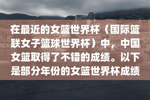 在最近的女篮世界杯(国际篮联女子篮球世界杯)中,中国女篮取得了不错的成绩。以下是部分年份的女篮世界杯成绩
