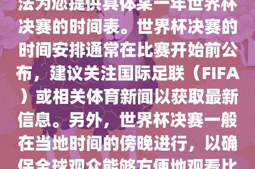 摘要:本文指出无法提供具体某一年世界杯决赛的时间表,建议读者关注国际足联或相关体育新闻以获取最新信息。世界杯决赛通常在当地时间的傍晚进行,以确保全球观众能够方便地观看比赛。具体决赛时间安排在比赛开始前公布。