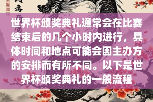 世界杯颁奖典礼通常会在比赛结束后的几个小时内进行,具体时间和地点可能会因主办方的安排而有所不同。以下是世界杯颁奖典礼的一般流程