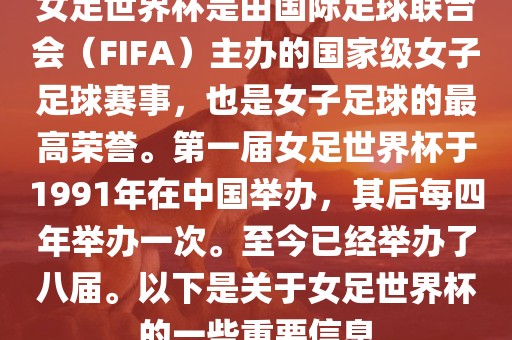 女足世界杯是由国际足球联合会(FIFA)主办的国家级女子足球赛事,也是女子足球的最高荣誉。第一届女足世界杯于1991年在中国举办,其后每四年举办一次。至今已经举办了八届。以下是关于女足世界杯的一些重要信息