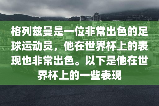 格列兹曼是一位非常出色的足球运动员,他在世界杯上的表现也非常出色。以下是他在世界杯上的一些表现