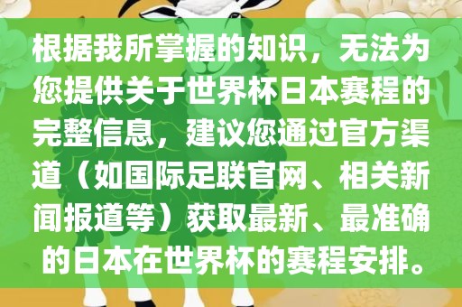 摘要:本文简要提及作者无法提供关于世界杯日本赛程的完整信息,并建议读者通过官方渠道获取最新、最准确的日本在世界杯的赛程安排。