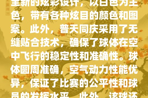 南非世界杯官方用球名为普天同庆,由阿迪达斯公司设计生产。该球以白色为主色,采用炫彩设计和无缝贴合技术,灵感来源于南非的标志性颜色和国旗图案。球体圆周准确,空气动力性能优异,确保了比赛的公平性和球员发挥水平。内置传感器技术可记录比赛精彩瞬间。普天同庆是一款设计精良、性能卓越的足球。