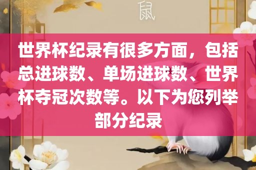 世界杯纪录有很多方面,包括总进球数、单场进球数、世界杯夺冠次数等。以下为您列举部分纪录