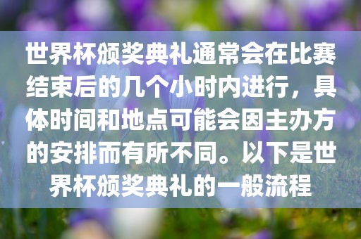 世界杯颁奖典礼通常会在比赛结束后的几个小时内进行,具体时间和地点可能会因主办方的安排而有所不同。以下是世界杯颁奖典礼的一般流程