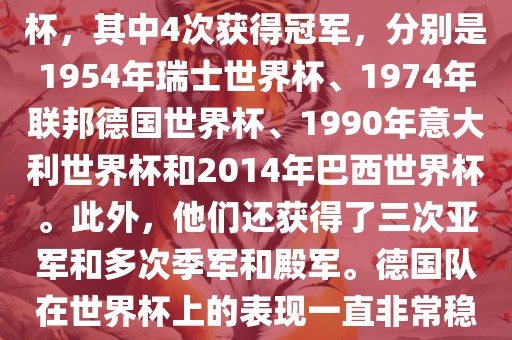 德国队在世界杯上的战绩非常辉煌。他们总共参加了8次世界杯,其中4次获得冠军,分别是1954年瑞士世界杯、1974年联邦德国世界杯、1990年意大利世界杯和2014年巴西世界杯。此外,他们还获得了三次亚军和多次季军和殿军。德国队在世界杯上的表现一直非常稳定,拥有强大的实力和深厚的足球底蕴。