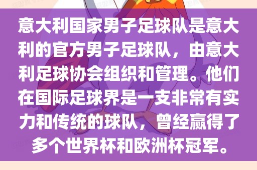 意大利国家男子足球队是意大利的官方男子足球队,由意大利足球协会组织和管理。他们在国际足球界是一支非常有实力和传统的球队,曾经赢得了多个世界杯和欧洲杯冠军。