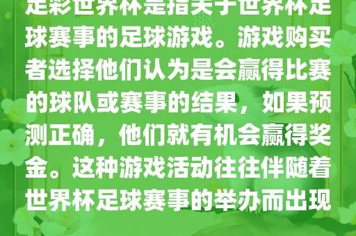 足彩世界杯是指关于世界杯足球赛事的足球游戏。游戏购买者选择他们认为是会赢得比赛的球队或赛事的结果,如果预测正确,他们就有机会赢得奖金。这种游戏活动往往伴随着世界杯足球赛事的举办而出现。