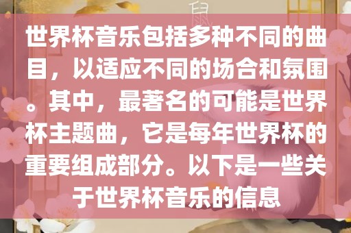 世界杯音乐包括多种不同的曲目,以适应不同的场合和氛围。其中,最著名的可能是世界杯主题曲,它是每年世界杯的重要组成部分。以下是一些关于世界杯音乐的信息